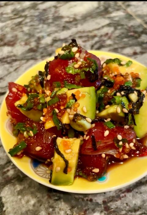 다시와 와사비 등 일본 풍미를 살린 상쾌한 참치 포케로, 사케와 완벽하게 어울립니다.
