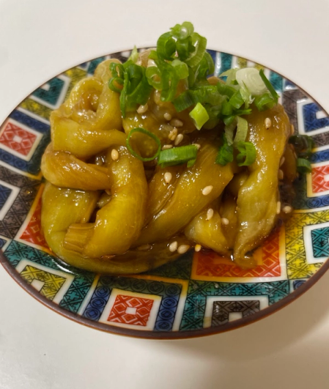 식초와 매운맛이 어우러진 산뜻하고 가벼운 가지 전채요리. 사케와 완벽하게 어울립니다.